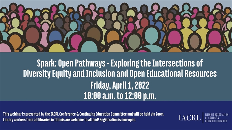 The IACRL Conference and Continuing Education Committee is partnering with the Consortium of Academic and Research Libraries in Illinois (CARLI) OER Committee to present the next Spark event: "Open Pathways - Exploring the Intersections of Diversity Equity and Inclusion and Open Educational Resources." This event will take place over Zoom on Friday, April 1st, from 10 AM to 12 PM.