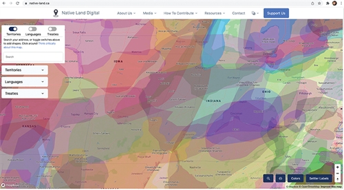 According to its website, “Native Land Digital is a Canadian not-for-profit organization, incorporated in December 2018. Native Land Digital is Indigenous-led, with an Indigenous Executive Director and Board of Directors who oversee and direct the organization.” View the project’s maps (pictured above) providing location-based information about nations, languages, and treaties: https://native-land.ca/