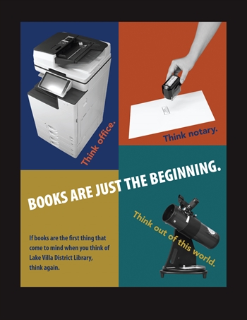This is the point when LVDL’s campaign solidified. Books Are Just The Beginning would become the anchor for a series of ads featuring familiar items not typically associated with the library: copy machine, notary, Wi-Fi hotspot, telescope. Bold graphic designs would be the key element with each item photographed to indicate motion, not glamour. Messaging would be clear and concise: “If books are the first thing that comes to mind when you think of Lake Villa District Library, think again.”