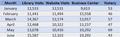 Although measuring impact wasn’t a requirement in the strategic plan, four key data points were tracked before, during, and after the campaign: Library Visits, Website Visits, Business Center (self-serve printing, copying, faxing, and scanning), and Notary. While the metrics don’t reveal much, March and May had the highest number of notary transactions. And during several of those transactions, the notary was told “This is my first time here. I’m so glad the library offers this service.”