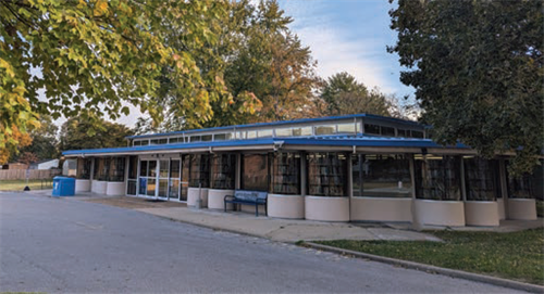 What Makes the Building Unique: The library is pre-fabricated! Porta-Structure Industries sold kits for 3,800 square foot library buildings. Promised to be constructed “in a matter of weeks,” Johnson Road’s build was delayed by the builder’s bankruptcy. The branch library houses 22,000 items in the small building, largely in part to its feature of revolving book carousels. Each carousel is housed in its own bay window, giving the steel-framed glass building a distinctive facade. However, these distinctive windows can be difficult to reproduce if broken, so the library keeps a spare in their shed. It is believed that the Johnson Road library is the last standing double Porta-Structure in Illinois!