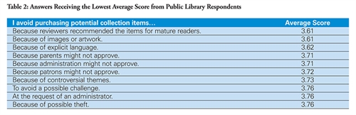 Because the size of the IFC Self-Censorship Survey data set was so large, the IFC decided to limit the initial step of its research to only respondents from public libraries. To provide a method for assessing the survey answers, a score was assigned for each answer that responded to the question prompt, “I avoid purchasing potential collection items….” A score of 4 was assigned for an answer of “Never,” 3 for “Sometimes,” 2 for “Frequently,” and 1 for “Always.”