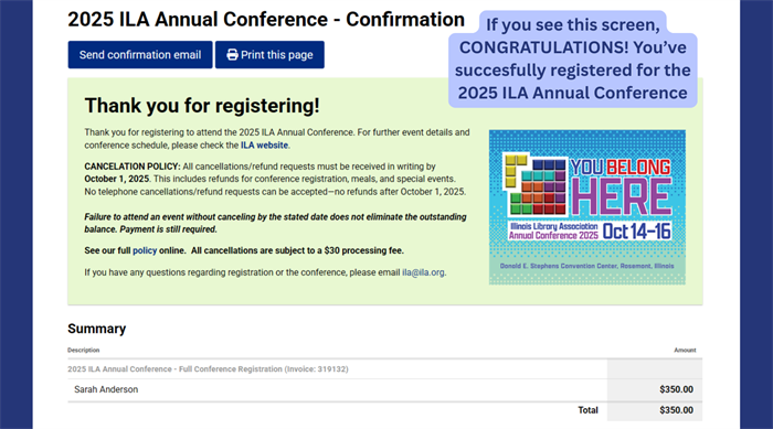After submitting your registration, you will be directed to a confirmation screen. An automated email will also be sent to the email address you used for your registration. If you DO NOT see the confirmation screen and/or DO NOT receive the confirmation email from ILA (check your spam too), please email ila@ila.org ASAP to confirm your registration has gone through.