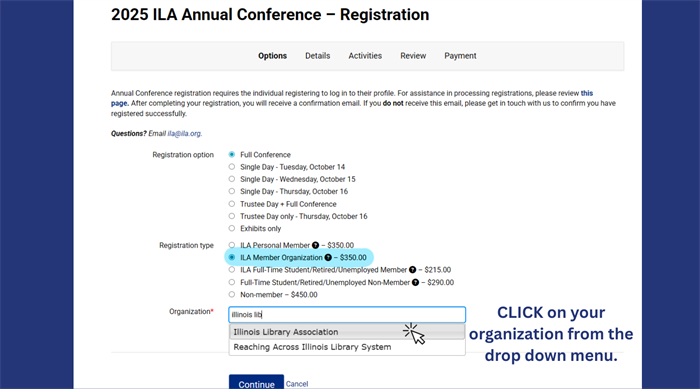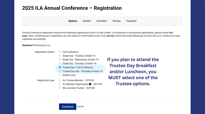 Step Three: Click Continue to enter your details. If you already have an ILA personal profile, your information should autopopulate. Double-check that your name, organization, and email are correct. If anything is incorrect, update the information on this screen. ILA sends registrants important event information via email before, during, and after the conference.
