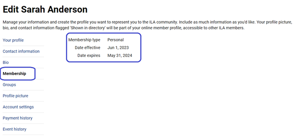 - To check your ILA membership status, sign into your ILA personal profile. Click View your profile and then Membership. You will see if you have a membership, and if so, which type of membership along with your member dates. You can also email ila@ila.org to find out your membership status. See below screenshot.