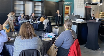 Library directors and trustees chat and enjoy breakfast with local legislators and/or legislative staff at the 2024 South Suburban & Chicago Meetup.