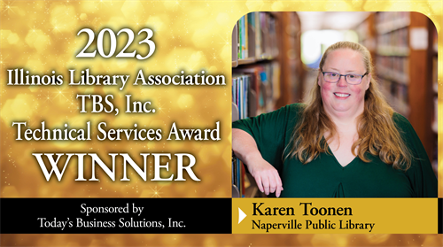 The Illinois Library Association (ILA) is proud to announce Karen Toonen, Collection Services Manager at Naperville Public Library, as the recipient of the 2023 TBS, Inc. Technical Services Award. This annual award, presented by ILA’s Resources and Technical Services Forum and sponsored by Today’s Business Solutions, Inc., is awarded to an individual who has made a substantial contribution in the area of library technical services, principally with commitment to leadership, programming, and professional development in the technical services field.