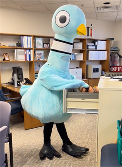 Description: Pigeon, from Mo Willems' beloved books, made a special visit to the library on Leap Day to dance with patrons. As you might expect, this inspired Pigeon to see if he could take over as library director in place of Samantha Johnson—after all, how hard could it be? (Very hard, as he quickly discovered. He's since flown the coop.)