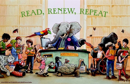 As Jason created, he thought a lot about circles because of the cyclical nature of Read, Renew, Repeat. But eventually, he decided it would be best portrayed by zooming in. A lot. From space to the circulation desk. “Then I just thought, well, what if there were just a bunch of animals, people and animals, just at a circulation desk?” Chin said. “It was the farthest away from the initial concept. It still has that kind of flow. The poster has a left to right flow, people going past the desk.”