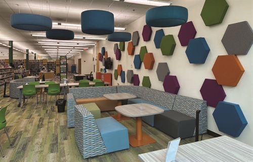 The new Teen Space is located in a nook within the Adult Services Department and is planned to take advantage of the adjacent makerspace and meeting room for afternoon and evening programming. The new space is visually defined by brightly colored sound panels and pendants, and it has a variety of seating types for studying, socializing, reading, and crafting. Director Smith says, “From my perspective, before the library had this space, the teens and tweens had no place to light. They milled about, not welcome with the younger kids and scowled at by the adults. It was tough. This space allows staff to be present, but not invasive in their space. Truly a third space with trusted adults and the chance to be with friends.”