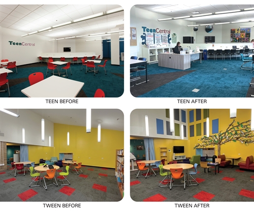 The results included two completely new and separate reimagined spaces: one in the Children’s Department for tweens (ages 8-12); and the other in Teen Central for teens (ages 13-18). By reimagining and restructuring these spaces, we could provide two different, yet similar, age groups with welcoming, engaging, and safe spaces, programs, and activities that would allow them to successfully discover, grow, play, and learn.