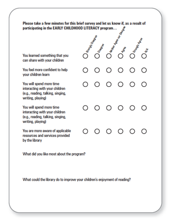 The surveys each have just six questions. Four questions ask the participant to choose on a five-point Likert scale from “Strongly Disagree” to “Strongly Agree” whether they learned something new from the program or service, increased their confidence in the subject area, anticipate a change in their behavior, and have increased awareness of library resources in support of the subject. The other two questions are open-ended, asking for general feedback on the program and suggestions for improvement. The following example shows a survey that could be given to parents of young children following a parent/child early literacy program.