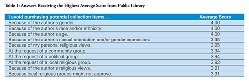 Because the size of the IFC Self-Censorship Survey data set was so large, the IFC decided to limit the initial step of its research to only respondents from public libraries. To provide a method for assessing the survey answers, a score was assigned for each answer that responded to the question prompt, “I avoid purchasing potential collection items….” A score of 4 was assigned for an answer of “Never,” 3 for “Sometimes,” 2 for “Frequently,” and 1 for “Always.”